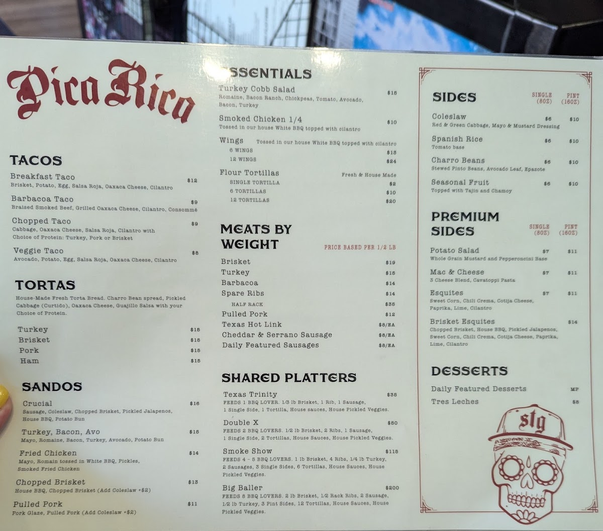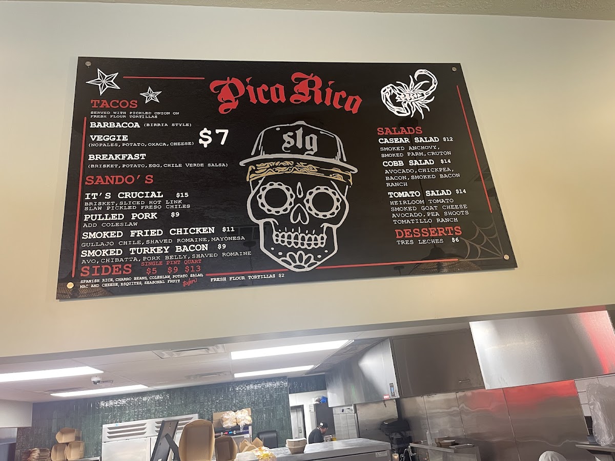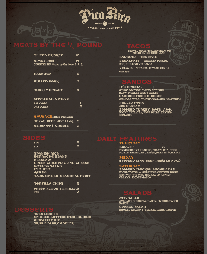 Corn, butter, mayo, sour cream, cotija cheese, paprika, lime juice with chopped brisket, house bbq sauce, pickled onion and jalapeño
